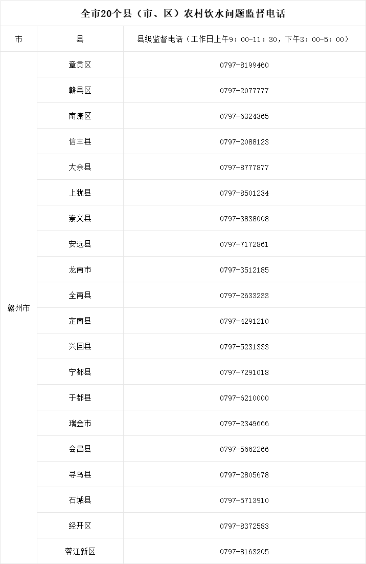 市級(jí)24小時(shí)服務(wù)熱線12345;市級(jí)監(jiān)督電話(工作日上午9:00-11:30,下午3:00-5:00)0797-8994631;郵箱gzssljnsk@163.com。