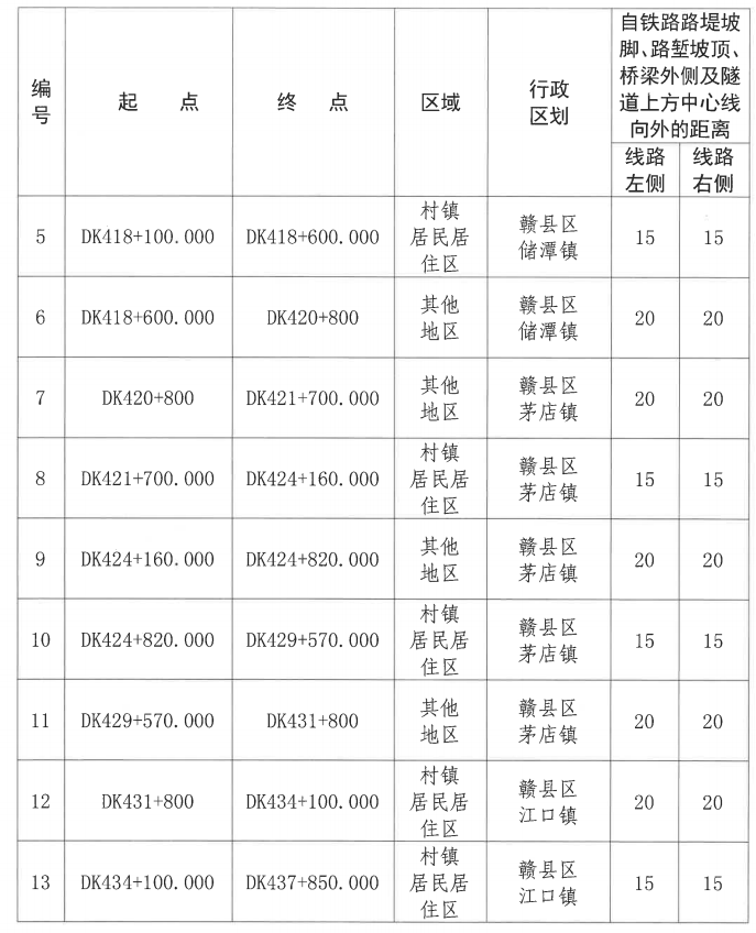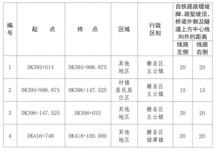 一、新建長(zhǎng)贛鐵路贛縣區(qū)段線路安全保護(hù)區(qū)范圍劃定見下表:
